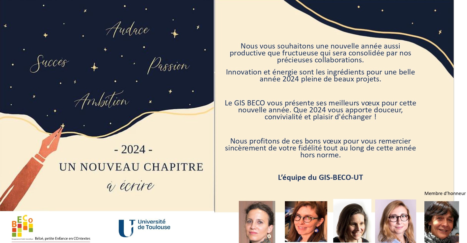 Anne Dupuy (MCF-HDR, Sociologie, UT2J/ISTHIA), Michelle Kelly-Irving (DR Inserm, UT3), Olivia Troupel (MCF, Psychologie, UT2J), Emmanuelle Rial-Sebbag (DR Inserm, UT3), Christine Mennesson (Pr. de Sociologie, LASSP, IEP), Marie Dajon (Coordinatrice administrative et scientifique GIS BECO-UT).
